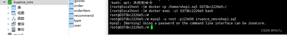 docker cp /home/shop1.sql ID:/ 将文件塞进mysql容器