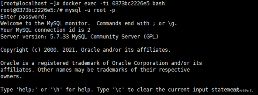 docker exec -ti ID bash ID指的是容器ID也可以使用容器名(进入mysql容器)