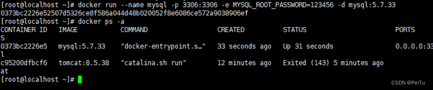docker run --name mysql -p 3306:3306 -e MYSQL_ROOT_PASSWORD=123456 -d mysql:5.7.33