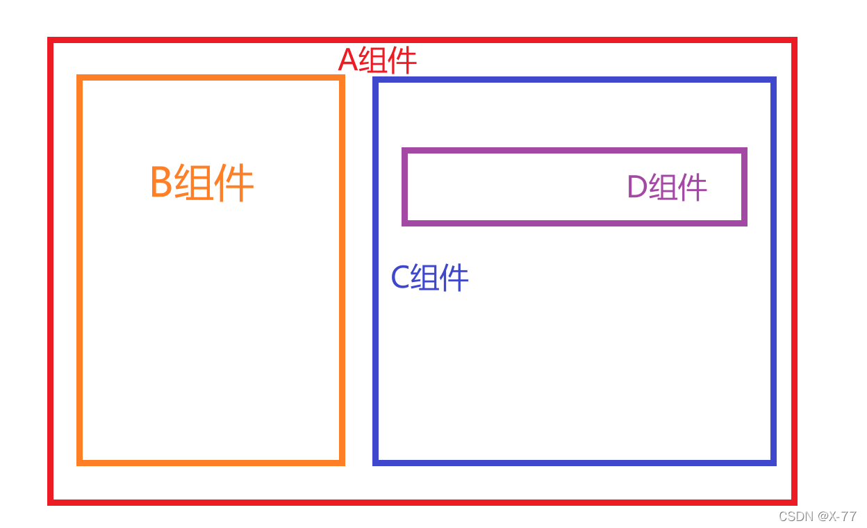 2.使用props也可以实现A组件给D组件传递数据,但是数据需要逐层传递,即A先传给C组件,C组件再传递给D组件。