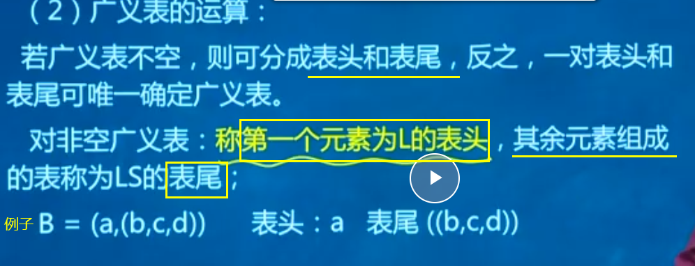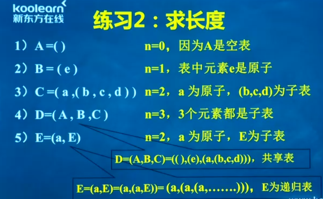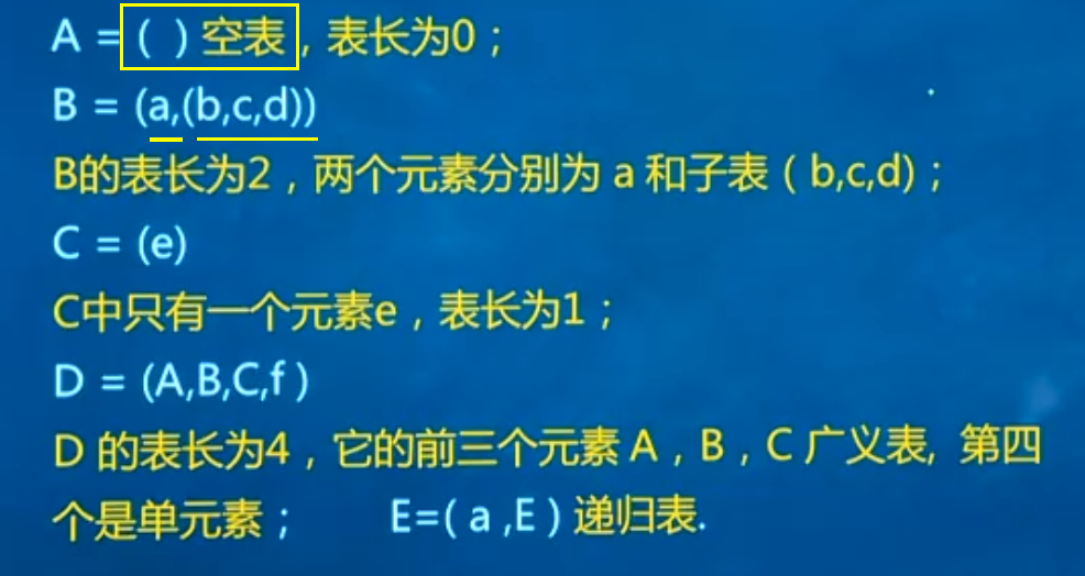 广义表可以是:空表、包含一个原子项的表、 包含一个原子项和其他子表的表、包含其他子表的表、包含自身的递归表