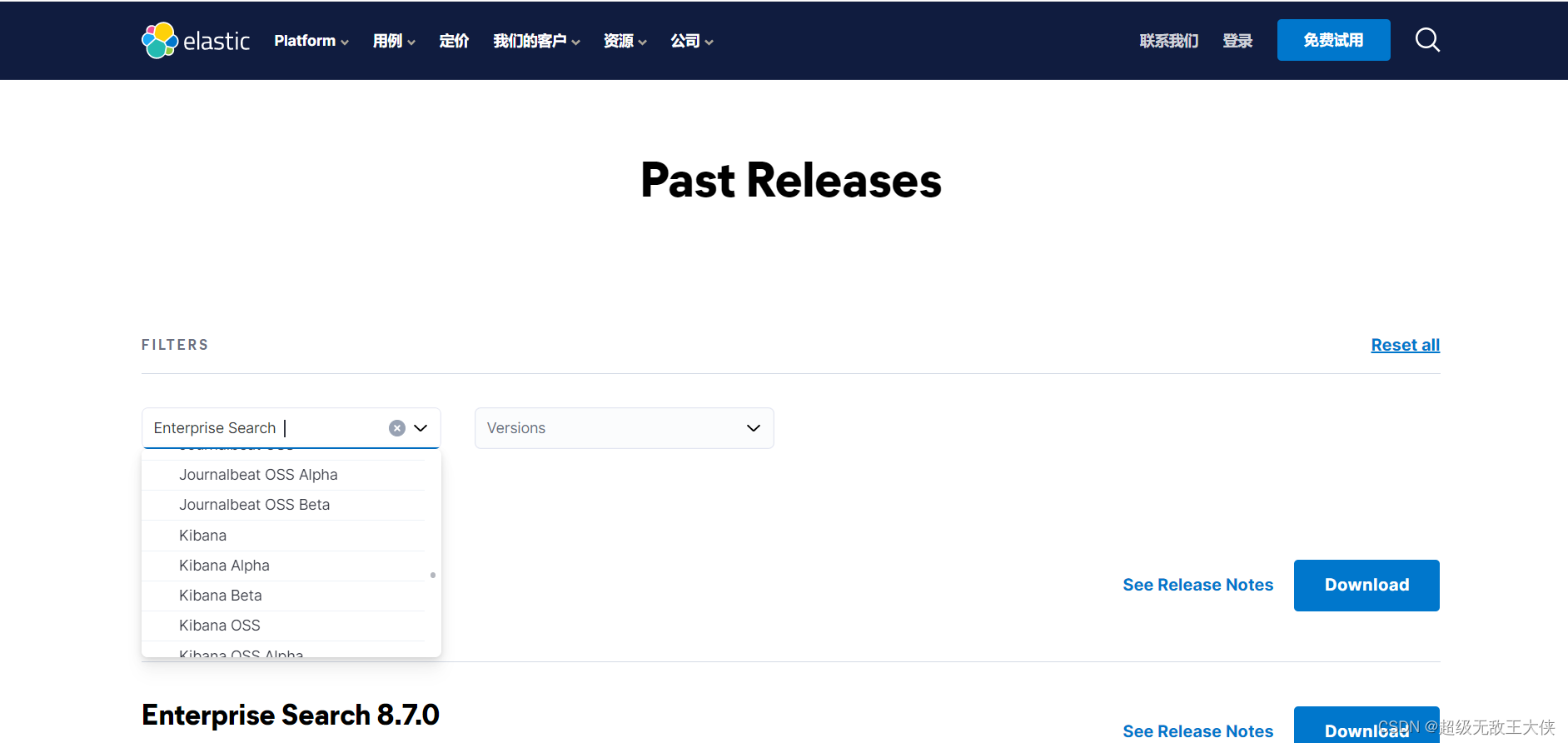 ELK(Elasticsearch、Kibana、Logstash)以及向ES导入mysql数据库数据或CSV文件数据,创建索引和可视化数据 在Products和version处分别选择需要下载的产品和版本,E(elasticsearch)L(logstash)K(kibana)三者版本必须相同将下载好的elk分别解压到相同路径下。