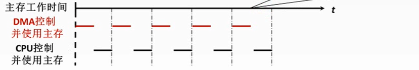 - DMA与CPU交替访存: 将CPU周期分为DMA访存和PU访存两个部分