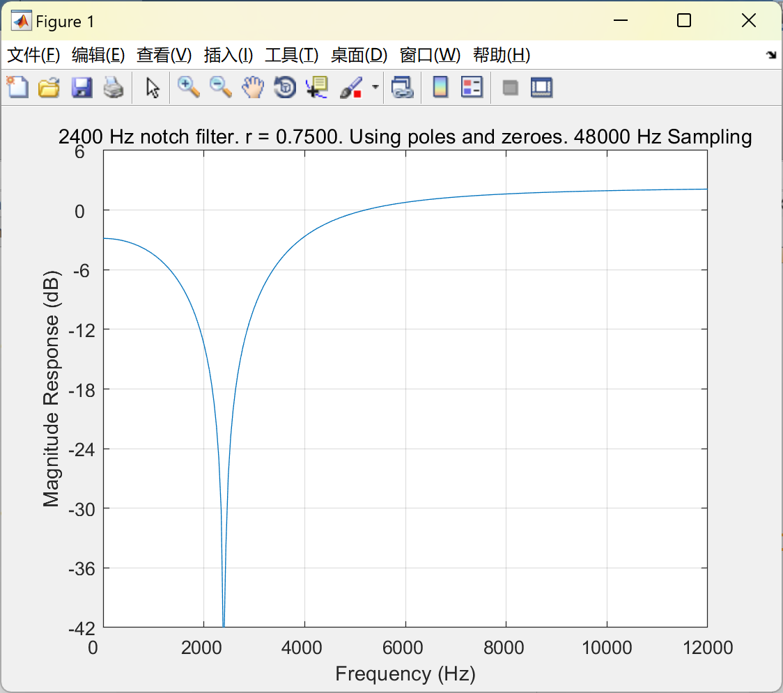 - 极点:在单位圆内靠近零点的位置放置极点,增强滤波器在目标频段的衰减斜率,同时保证系统稳定性。