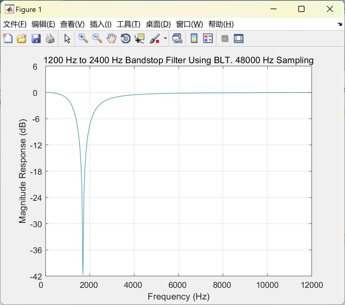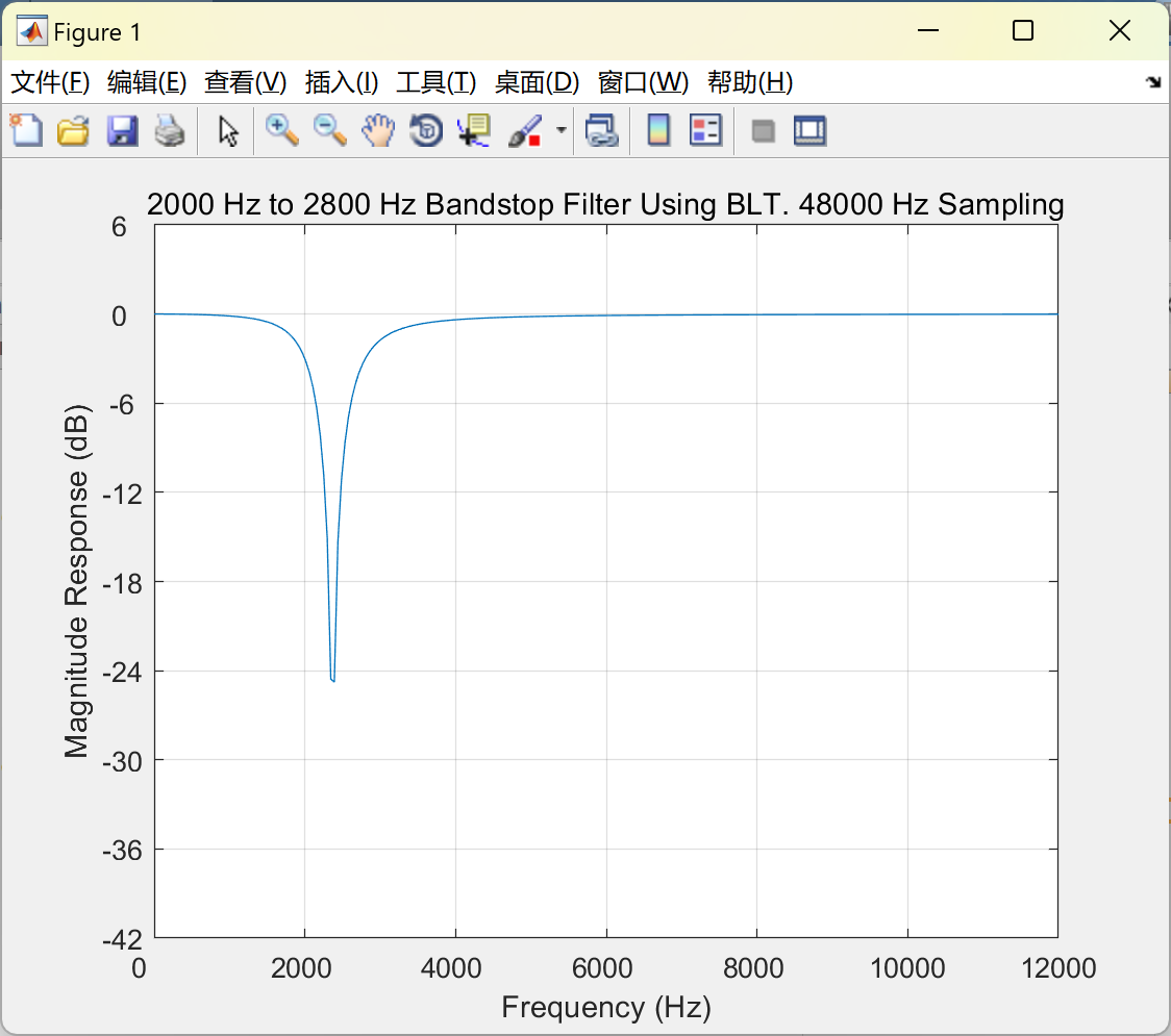 使用freqz()绘制幅频响应曲线,验证阻带衰减和通带平坦度:matlab[H, f] = freqz(bz, az, 512, Fs);magnitude = 20*log10(abs(H));plot(f, magnitude); grid on;xlabel('Frequency (Hz)'); ylabel('Magnitude (dB)');title('2400 Hz Notch Filter Response');预期结果:在2400 Hz处衰减≥40 dB,通带波纹≤1 dB。