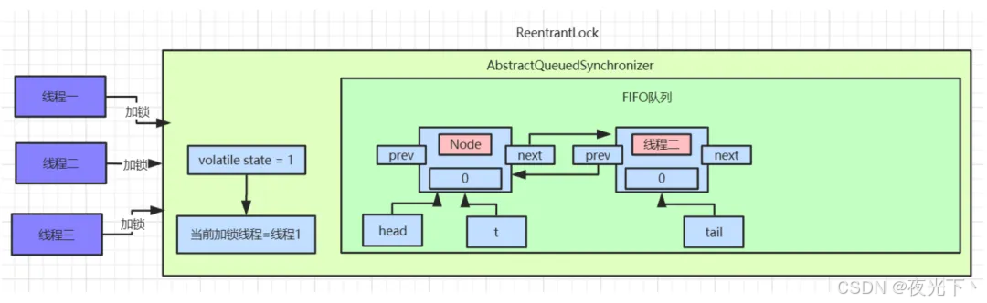 另外 AQS 中实现的 FIFO 队列(CLH 队列)其实是双向链表实现的,由 head, tail 节点表示,head 结点代表当前占用的线程,其他节点由于暂时获取不到锁所以依次排队等待锁释放。