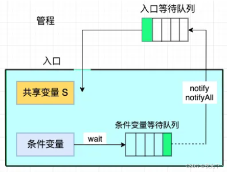 由此可见,管程就是一个对象监视器。任何线程想要访问该资源(共享变量),就要排队进入监控范围。进入之后,接受检查,不符合条件,则要继续等待,直到被通知,然后继续进入监视器。