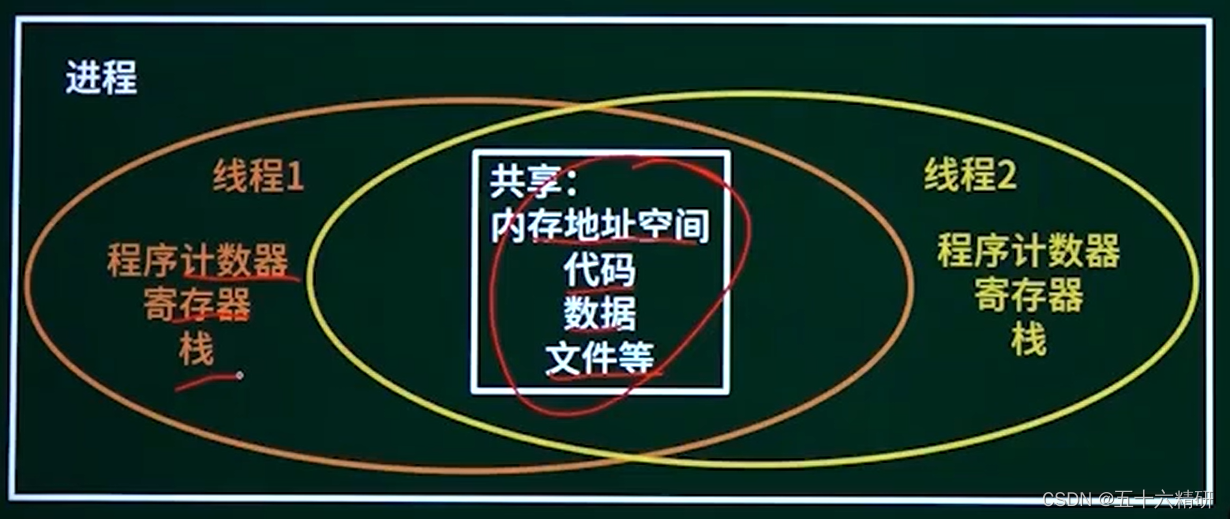 不同的线程中共享的是:内存地址空间、代码、数据、文件等。不共享的:程序计数器、寄存器、栈