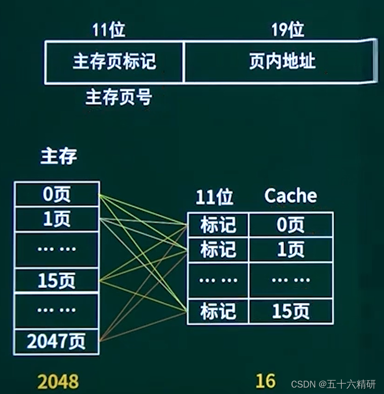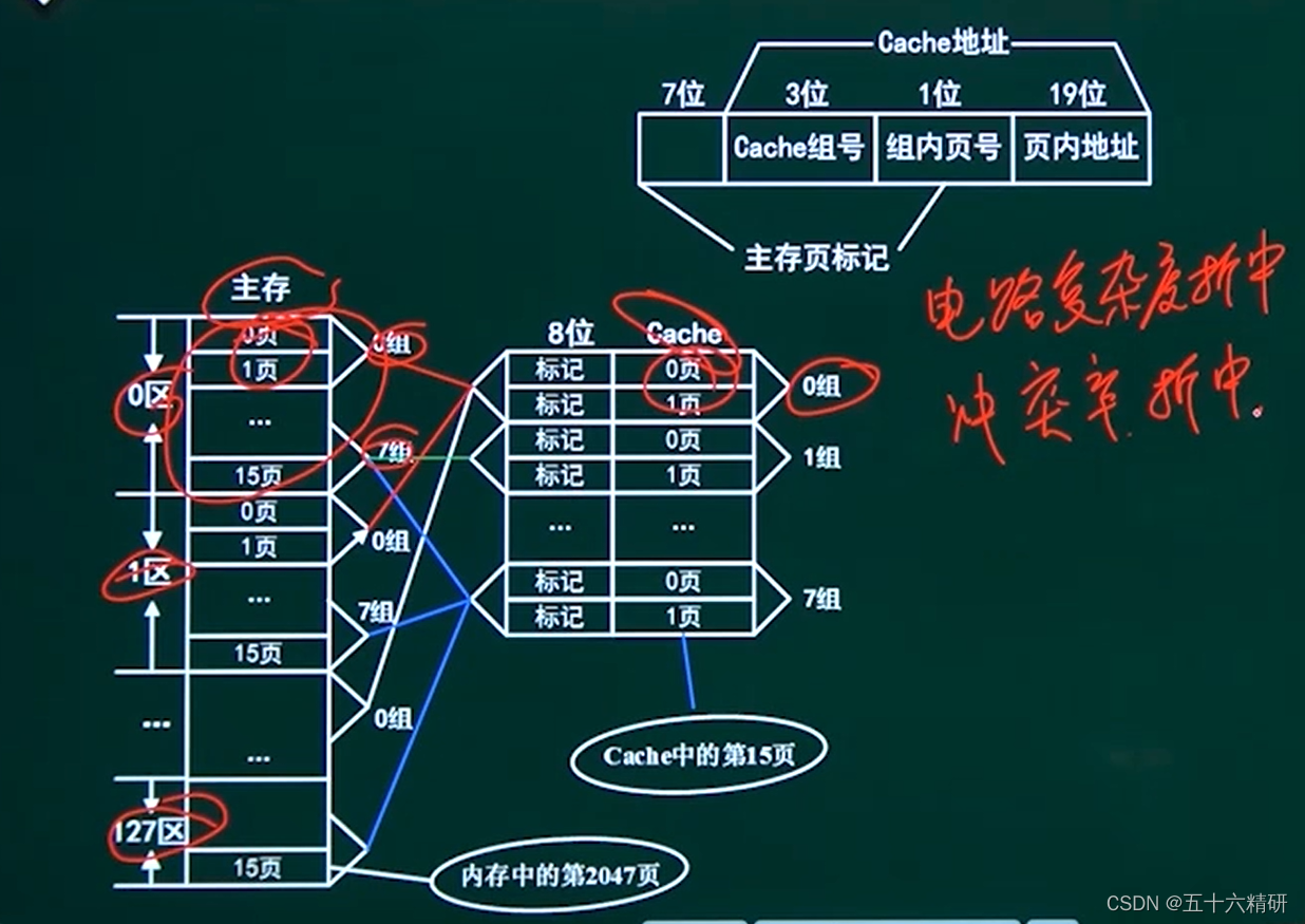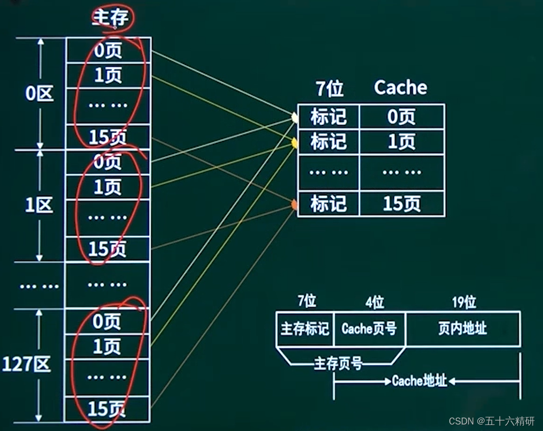 在直接相连映像中主存里各个区的0页对应cache的0页,1页对应1页这样,但是当一个区的0页放入cache中,其他区的0页就不能放入了(因为需要一一对应,不能放入不对应的页中)。这也导致这种方法电路简单但是冲突高