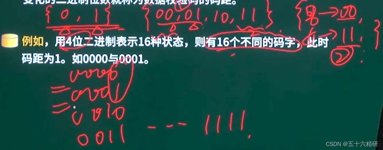 码距:任何一种编码都由许多码字构成,任意两个码字之间最少变化的二进制位数就称为数据校验码的码距