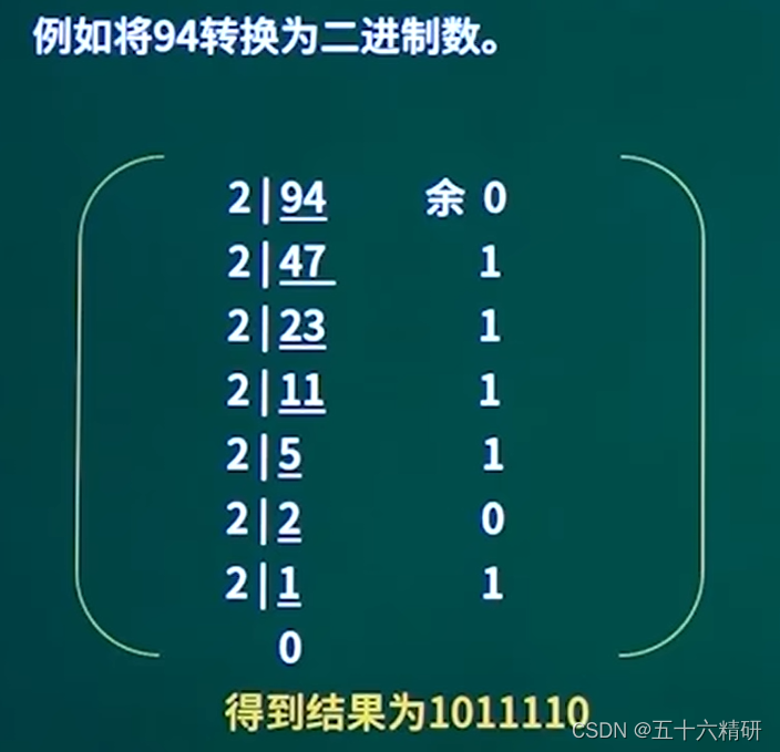 解释:也称除基取余法,即将十进制除以R得出的结果和余数,结果再除R知道0为止,得到的进制结果取倒叙的余数