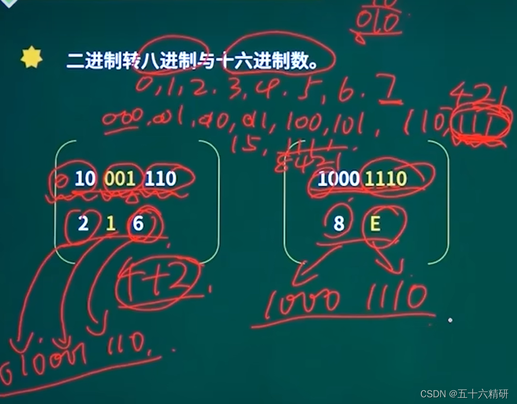 解释:当要转八进制的时候将二进制从后向前,每三位分成一组,三位从左到右标记成4 2 1,然后把有1的标记相加得到一个数,将所有组的数组合就是八进制。同理十六进制多加一位,并标记成8