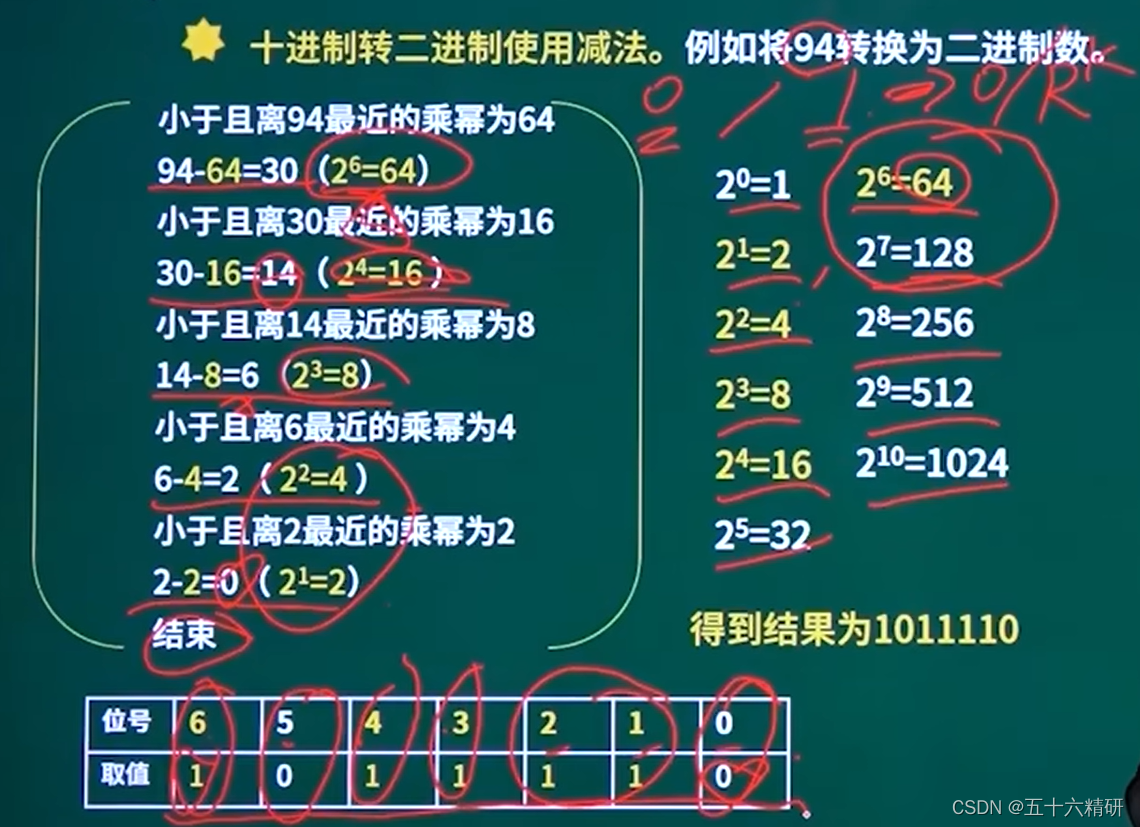 解释:列出2的0到n次方,并从与要转换的数想近最大的数开始减,每减一次,记录一次1,直到减到2^0