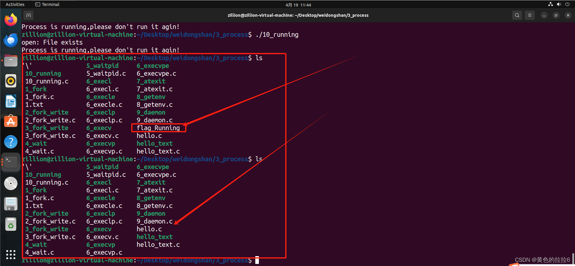 Linux 2.进程(小技巧:让程序不能被多次运行) 具体做法是程序在执行之初去判断一个特定的文件是否存在,若存在则标明进程已经在运行,若不存在则标明进程没有在运行。然后运行程序时去创建这个文件。意思就是说当我们./a.out去运行程序时,如果当前还没有这个程序的进程运行则运行之,如果之前已经有一个这个程序的进程在运行则本次运行直接退出(提示程序已经在运行)。我们守护进程一般都是服务器,服务器程序只要运行一个就够了,多次同时运行并没有意义甚至会带来错误。因为守护进程是长时间运行而不退出,因此./a.out执行一次就有一个进程,执行多次就有多个进程。