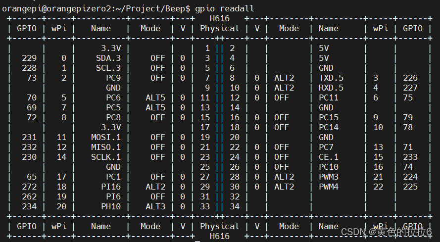 1.【Orangepi Zero2】安装wiringOP库、驱动蜂鸣器 特此说明一下上图的 1 到 26 号引脚与开发板上的 26 Pin 引脚是一一对应的,27、29、31、33 号引脚对应 OrangePi ZERO 2 开发板上 13 Pin 的10、11、12、13号引脚,28、30、32、34 号引脚为空,请直接忽略。是一个基于香橙派编写的 GPIO 访问库,可用于编程和设置香橙派的 GPIO 引脚。原因就是 wiringOP 库属于第三方库,在编译时要用-l链接库才能编译。打开之后,可以看到编译时要链接的全部第三方库。安装wiringOP库。