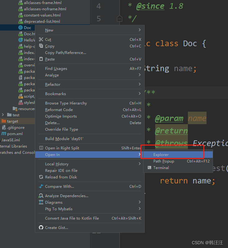 JavaDoc 输入 javadoc -encoding UTF-8 -charset UTF-8 Doc.java。生成这个类的doc帮助文档,可以点击index.html查看。设置好以后,点击生成,可以点击index,html进行查看。javadoc命令是用来生成自己的API文档的。首先点击tools工具找到javadoc。在idea中右键类名,找到文件储存位置。idea生成javadoc文档。命令行生成doc文档。