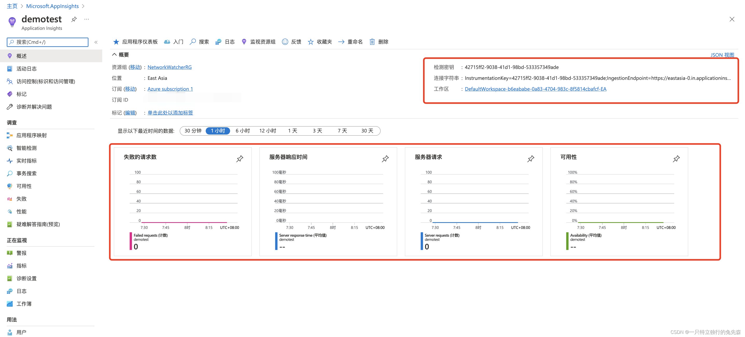 7.在资源配置里面,我们即可看到相关的Application Insights 配置页面,此处我们需要关注下这个“检测密钥” 后续我们会用到