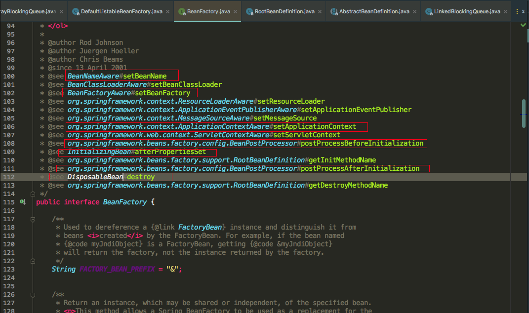 我们在spring的BeanFactory工厂列举了很多接口,代表着bean的生命周期,我们主要记住的是我圈红线圈出来的接口, 再结合spring的源码来看这些接口主要是在哪里调用的