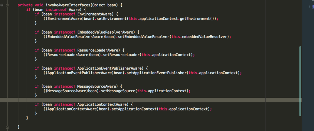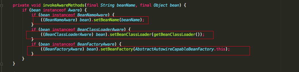 可以看到initializeBean方法中,首先调用的是使用的Aware接口的方法,我们具体看一下invokeAwareMethods方法中会调用Aware接口的那些方法