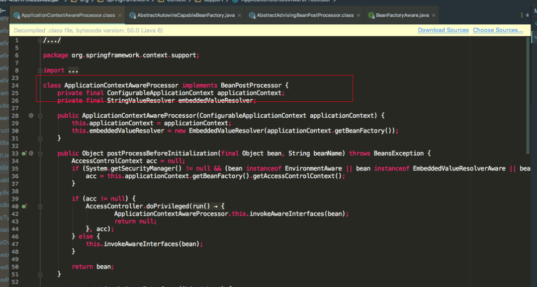 我们可以知道如果我们实现了BeanNameAware,BeanClassLoaderAware,BeanFactoryAware三个Aware接口的话,会依次调用setBeanName(), setBeanClassLoader(), setBeanFactory()方法,再看applyBeanPostProcessorsBeforeInitialization源码