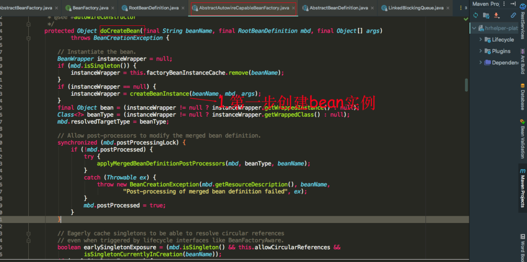 AbstractAutowireCapableBeanFactory类的doCreateBean方法是创建bean的开始,我们可以看到首先需要实例化这个bean,也就是在堆中开辟一块内存空间给这个对象,createBeanInstance方法里面逻辑大概就是采用反射生成实例对象,进行到这里表示对象还并未进行属性的填充,也就是@Autowired注解的属性还未得到注入
