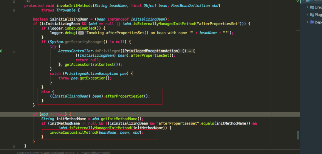 我们可以看到第二步就是填充bean的成员属性,populateBean方法里面的逻辑大致就是对使用到了注入属性的注解就会进行注入,如果在注入的过程发现注入的对象还没生成,则会跑去生产要注入的对象,第三步就是调用initializeBean方法初始化bean,也就是调用我们上述所提到的接口