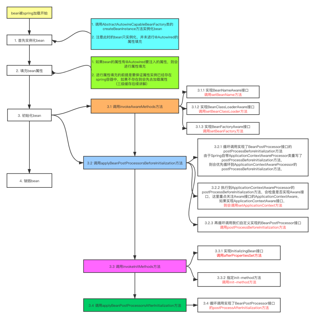 发现跟之前的postProcessBeforeInitialization方法类似,也是循环遍历实现了BeanPostProcessor的接口实现类,执行postProcessAfterInitialization方法。整个bean的生命执行流程就如上面截图所示,哪个接口的方法在哪里被调用,方法的执行流程