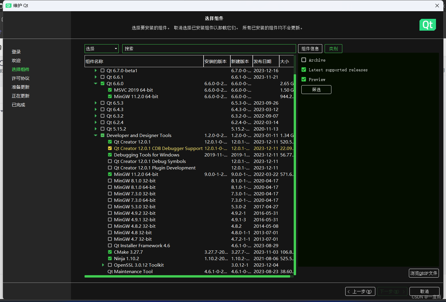 有安装路径选择,就修改一下自定义的路径即可。注意:记住安装路径。选择组件,可简单点按照下图选即可,QT版本选择6.6.0,后续可自行增添组件,最好不要乱动版本。