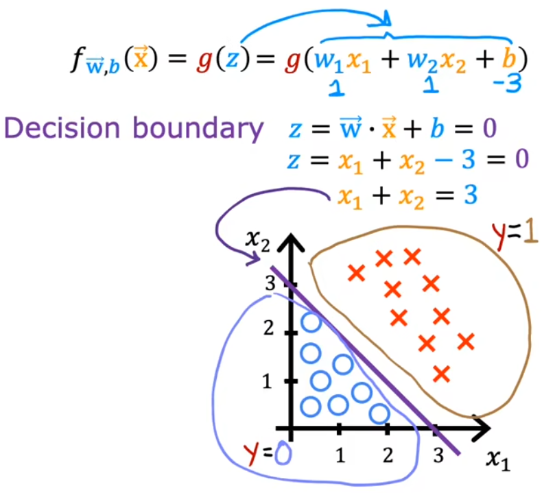 x1+x2=3(下图紫色直线),决策边界的下方认为是0、上方认为是1,符合直观: