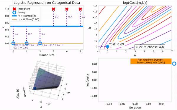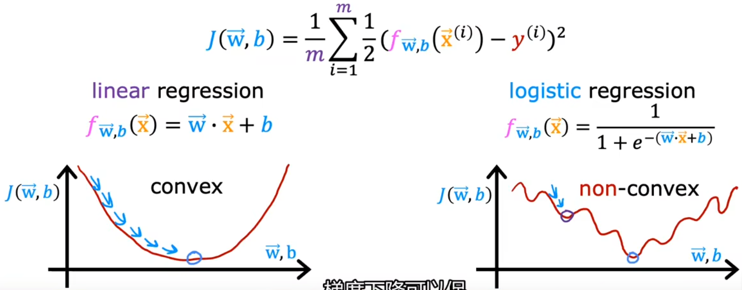 Logistic regression modelLogistic cost functionGradient descentrepeat until convergence:fw,b(x)=1+e−(w⋅x+b)1:w,bminJ(w,b)=−m1i=1∑m[y(i)log(fw,b(x(i)))+(1−y(i))log(1−fw,b(x(i)))]:⎩