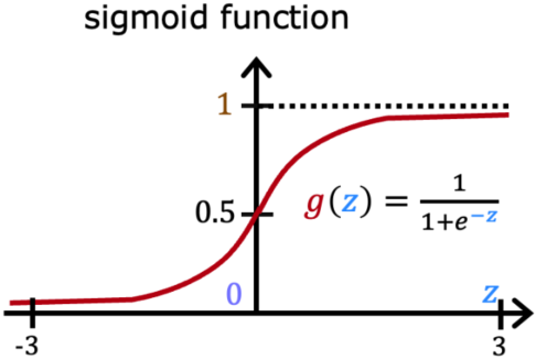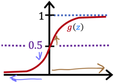 \begin{aligned} & f_{\vec{w},b}(\vec{x}) = g(z) \ge 0.5 \Longrightarrow \hat{y}=1\\ & f_{\vec{w},b}(\vec{x}) = g(z) < 0.5 \Longrightarrow \hat{y}=0 \end{aligned}