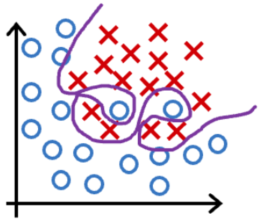 - 过拟合/高方差:决策边界非常扭曲,以图完美符合所有的训练数据,但显然并不具有泛化特性。