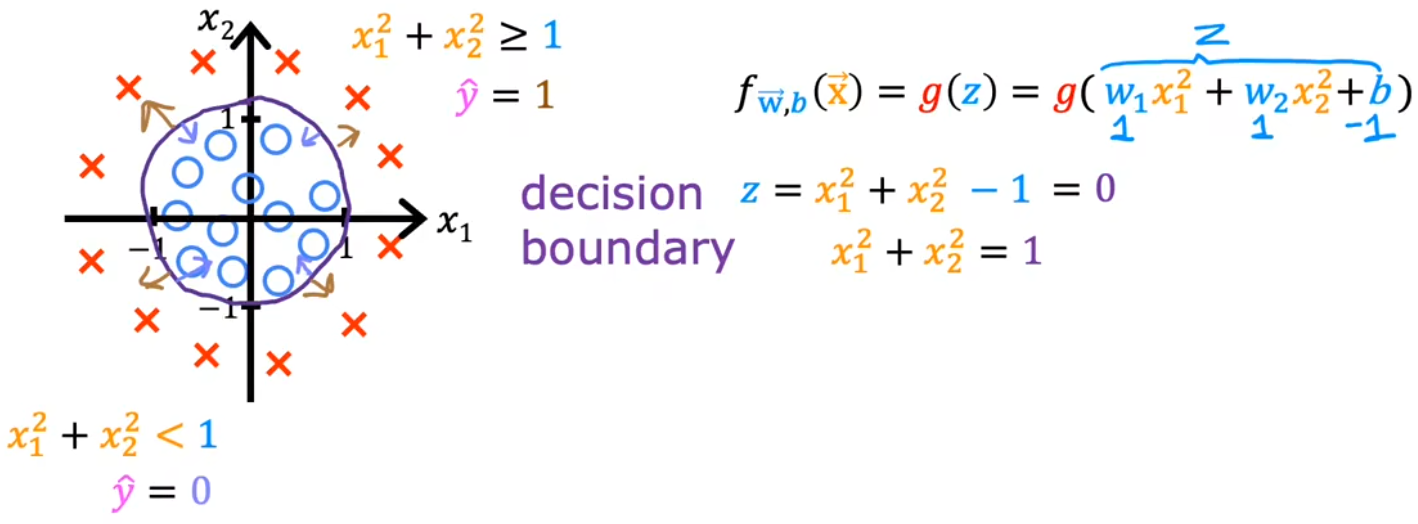x12+x22=1(下图紫色圆),决策边界的内部认为是0、外部认为是1,符合直观: