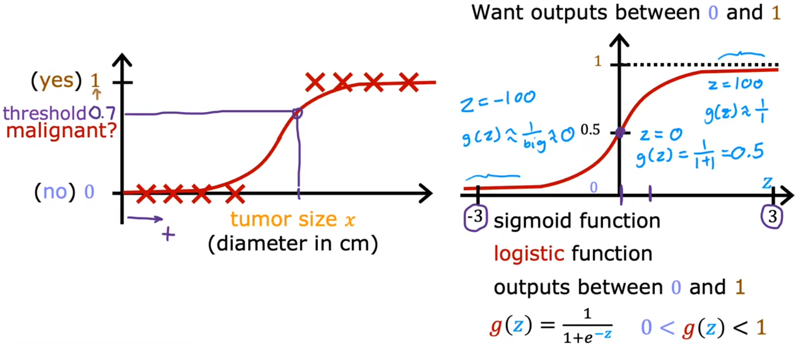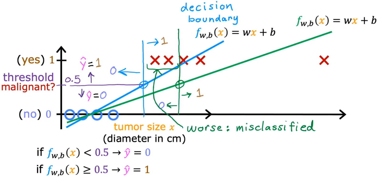 fw,b(x)=g(z)≥0.5⟹y^=1fw,b(x)=g(z)<0.5⟹y^=0