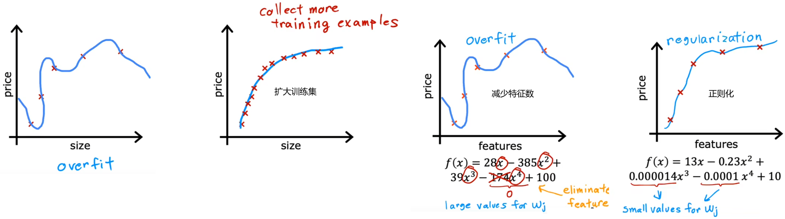 后续课程会介绍如何避免算法出错,并且介绍用于识别 欠拟合/过拟合 的工具,但现在先只介绍如何解决过拟合: