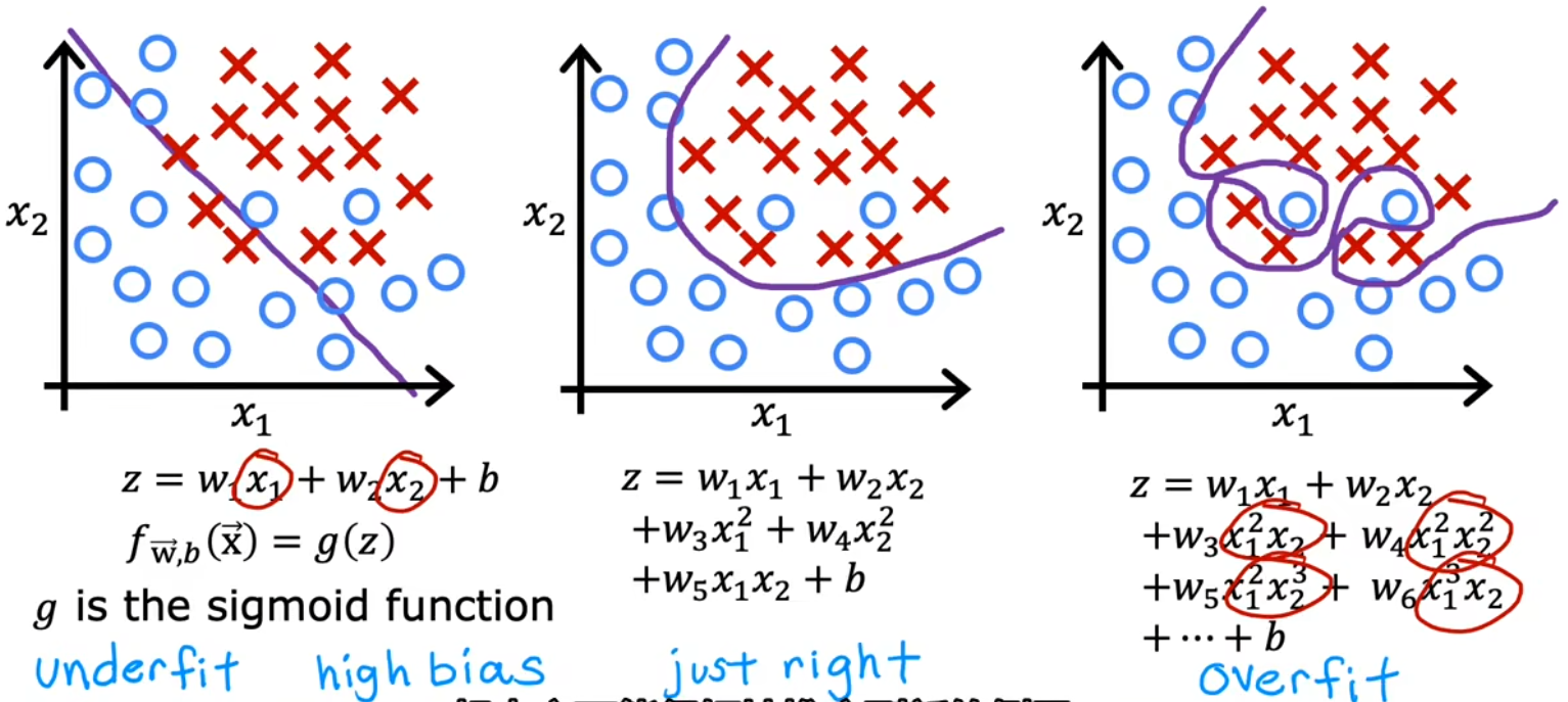 - just right:决策边界是椭圆或椭圆的一部分,较好的拟合了数据,虽然并不是完美符合所有的训练数据。