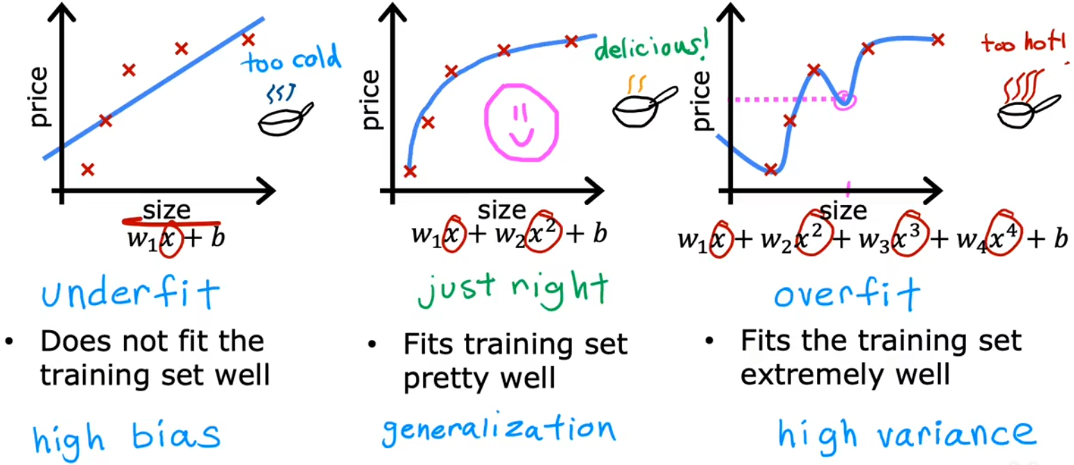 - just right:恰到好处!没有特别的术语描述这种情况。但即使对于一个全新的输入,也可以给出恰当的输出,于是称这样的模型具有很好的“泛化(generazilization)”特性。