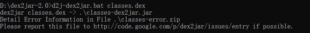 打开cmd命令行,切换到dex2jar的目录,输入命令 d2j-dex2jar.bat classes.dex ,如下图,就说明反编译成功