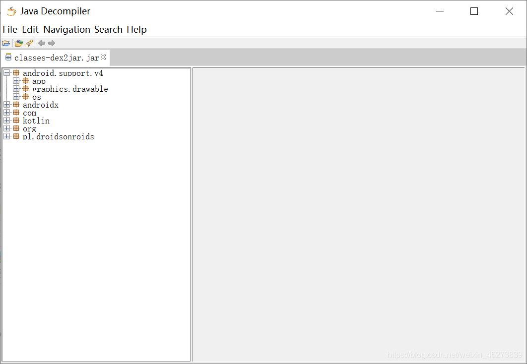 2. 将 jd-gui压缩包解压,里面有个jd-gui.exe文件,点击这个可执行文件,将第一步的到的classes-dex2jar.ja拖到jd-gui.exe工作区就可以得到想要的源代码了,如图: