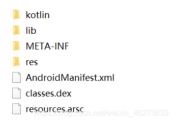 首先将apk文件修改后缀名为zip,然后解压缩,得到解压之后的文件夹,文件夹中有一个classes.dex文件(这个文件就是java文件编译再通过dx工具打包而成的),如下图: