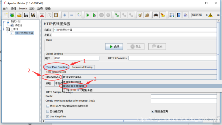 设置“目标控制器”,Test Plan Creation –> 目标控制器 –> “测试计划>线程组”