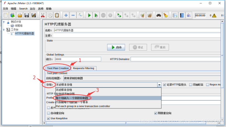 设置“分组”,Test Plan Creation –>分组 –> “每个组放入一个新的控制器”
