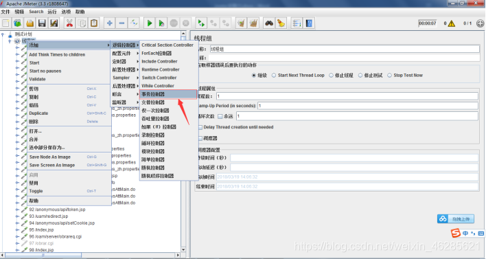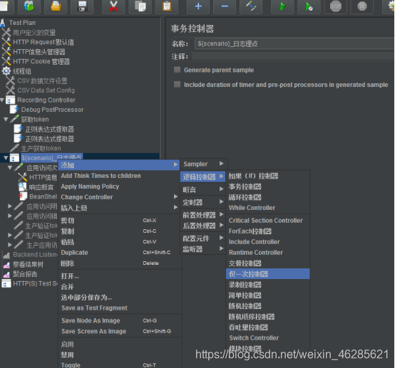 步骤:“添加”->”逻辑控制器” ->”事务控制器”