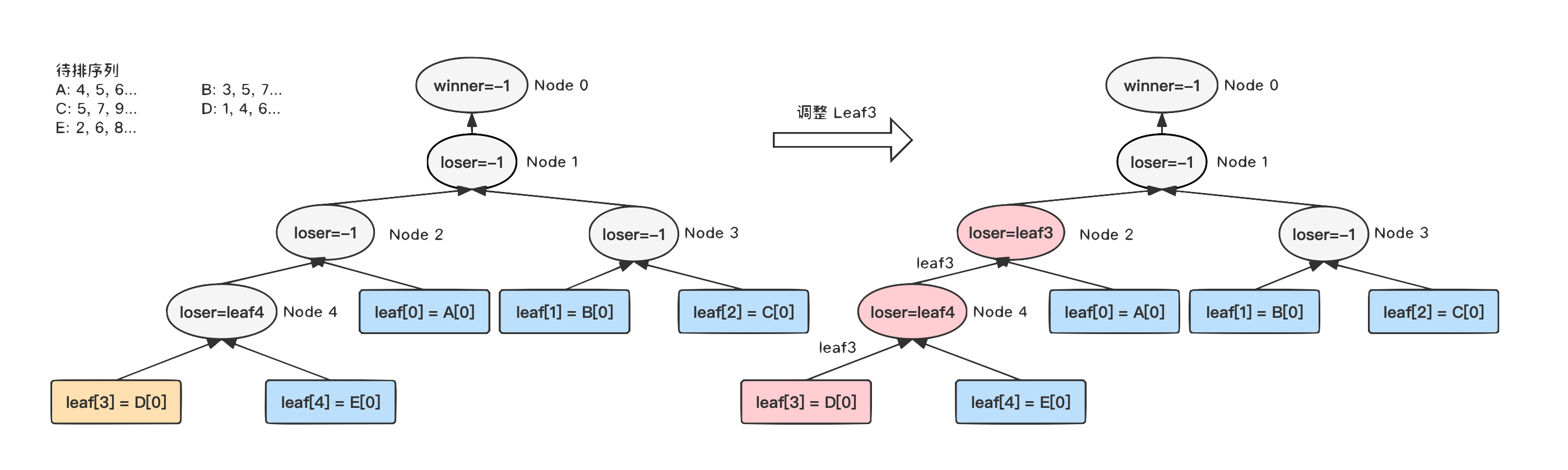 1)调整叶子节点 Leaf4,由于父节点当前还没有败者,因此设置为 Leaf4;