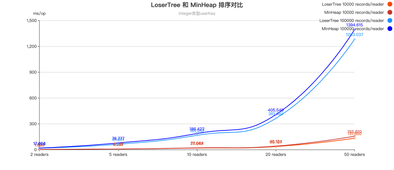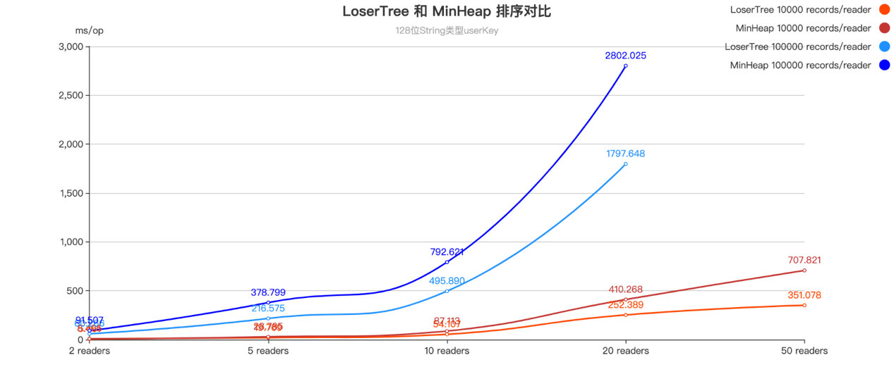 基于 JMH 框架,我们进行了 UserKey 分别为 Integer 和 128 位 String 类型,在不同数量的 RecordReader 和不同数据量上的读取性能基准测试,LoserTree 整体表现优于堆排序,UserKey 的类型越复杂,进行比较的开销越高,优化效果越明显。