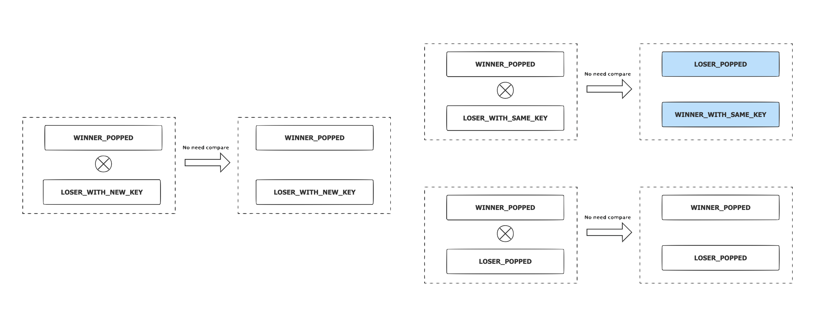 Local Winner 的状态是 WINNER_POPPED,父节点的状态是:LOSER_WITH_NEW_KEY:无需比较和转换状态,子节点获胜;LOSER_WITH_SAME_KEY:无需比较,父节点获胜并将状态切换为 WINNER_WITH_SAME_KEY,子节点的状态切换为 LOSER_POPPED;LOSER_POPPED: 无需比较和转换状态,子节点获胜。