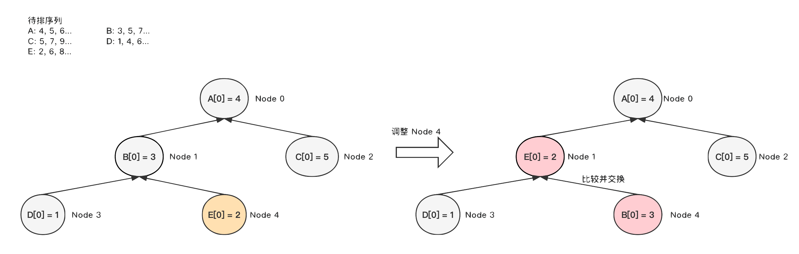 和堆排序类似,每次都会从头节点取出一个数据,区别是堆排序是自顶向下进行调整,LoserTree 是自底向上进行调整。将对应的叶子节点待排序列元素后移一个,然后自底向上不断进行比较,直到到达头结点,得出新的全局胜者。