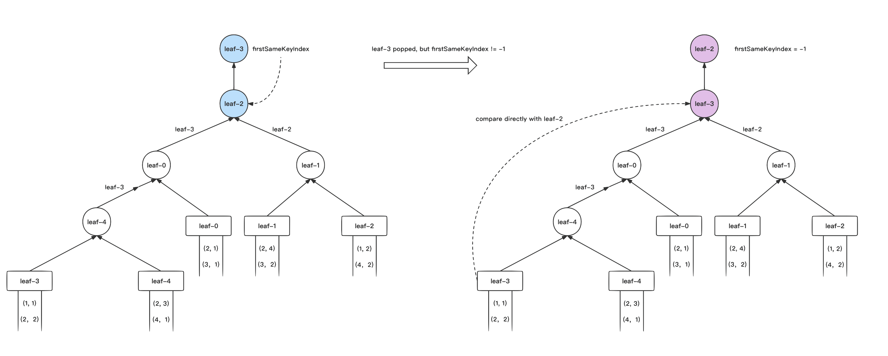 通过在叶子节点中增加 FirstSameKeyIndex 字段,用于记录我们首次战胜的相同 UserKey 的节点位置,这样我们可以快速区分出树中是否有相同的未处理 UserKey 节点,如果有,我们可以直接将这两个节点的状态进行替换,并从这个位置向上进行调整,从而减少调整的层数。