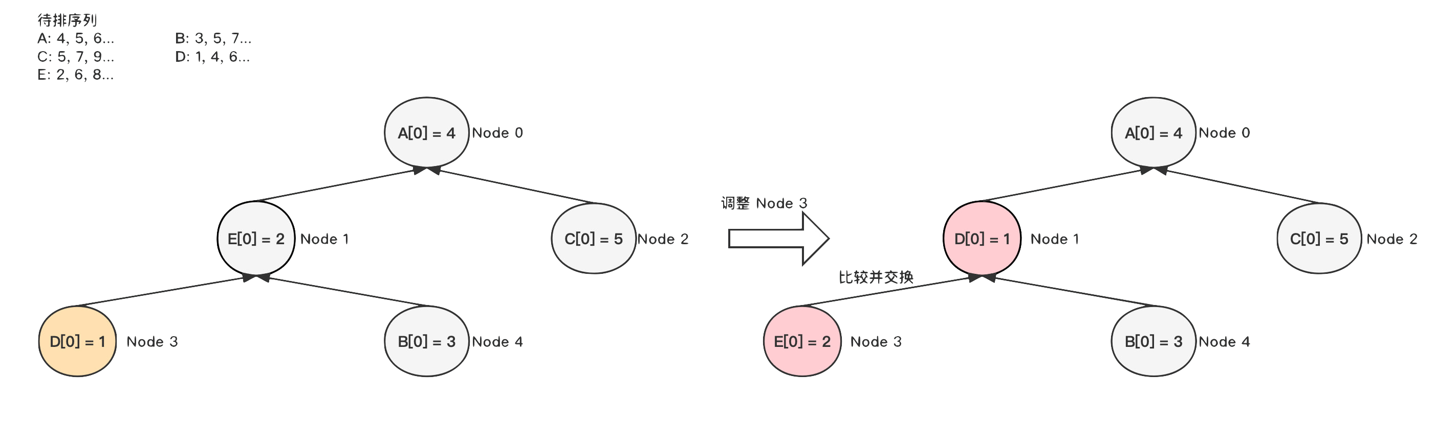 每次排序时会从头节点取出当前最小的数据,将对应序列的下一个元素放到头结点,然后再自顶向下不断进行调整。每次向下调整时需要和左右两个子节点同时进行比较,选出最小值。