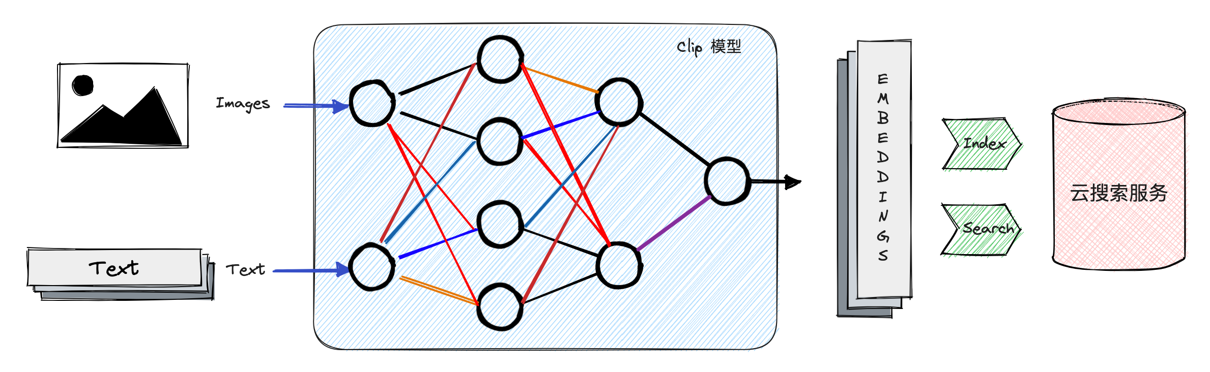 图片搜索技术,以文本描述和图片作为检索对象,分别对 image 和 text 进行特征提取,并在模型中对文本和图片建立相关联系,然后在海量图片数据库进行特征向量检索,返回与检索对象最相关的记录集合。其中特征提取部分采用 CLIP 模型,向量检索使用火山引擎云搜索服务在海量图片特征中进行快速的搜索。